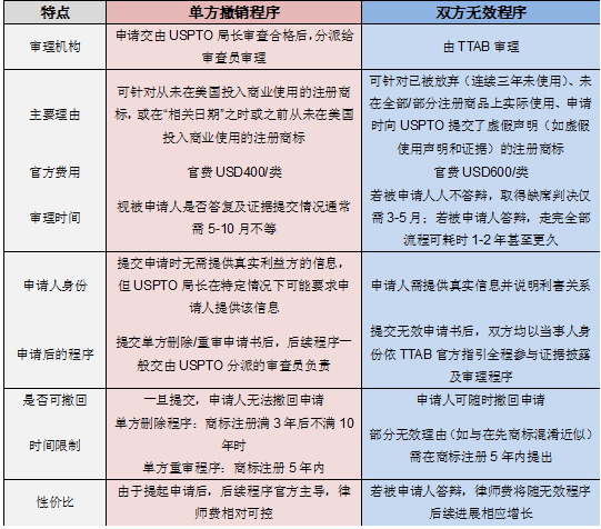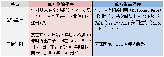 單方撤銷程序分為單方刪除程序和單方重審程序,根據美國《商標法》第16A、16B條及《審查指南》第1716條的規定,筆者將這兩項程序簡要對比如下表: