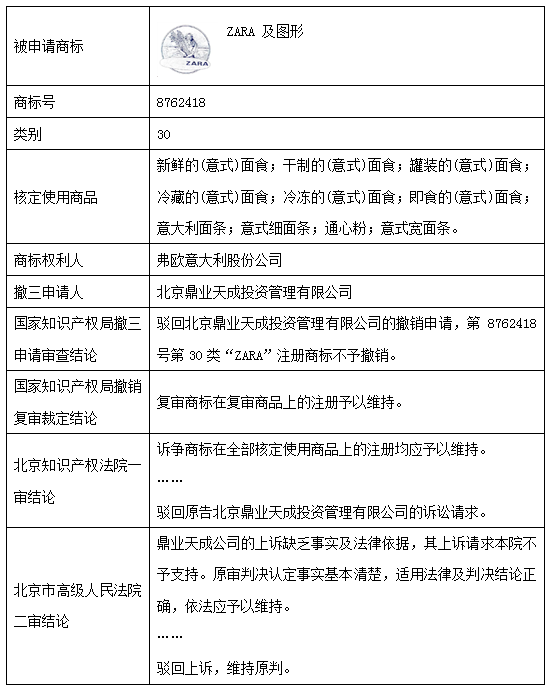 2019年01月15日,北京鼎業天成投資管理有限公司向國家知識產權局商標局提交撤銷三年不使用申請,申請撤銷弗歐意大利股份公司名下第8762418“ZARA及圖形”商標在第30類“新鮮的(意式)面食”等全部核定使用商品上的注冊。弗歐意大利股份公司在收到商標局下發的提供使用證據通知后,于規定期限內提交了答辯理由及被申請商標在指定期限內(即2016年01月15日至2019年01月14日)的使用證據。2019年08月27日,商標局經審查,裁定被申請商標不予撤銷。