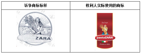由以上對比可以看出,權利人實際使用的商標,圖形背景部分與注冊商標形狀略有不同,文字部分也多了英文“pasta”,但“pasta”中文含義為“意大利面食”,實際上為訴爭商標核定使用商品的通用名稱,因此自身缺乏顯著性,權利人實際使用的商標顯著性識別要素仍為“ZARA及圖形”。