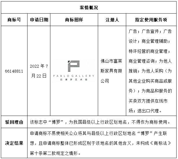 最后,《商標審查審理指南》中:以地名作為商標本身缺乏顯著性或顯著性較弱,不利于消費者區分商品和服務的來源,容易造成混亂。就立法目的而言,《商標法》第十條第二款之規定的立法目的為防止商標攀附地名的知名度而造成相關消費者對商品/服務產生來源造成誤認。針對本案而言,佛山市富萊斯家具有限公司已經使用了“巴博羅”商標長達十幾年之久,申請商標是在“巴博羅”商標的基礎上進行的延伸注冊,屬于正常的企業發展策略。佛山市富萊斯家具有限公司申請注冊申請商標的行為不存在攀附“博羅縣”知名度,并且申請商標指定使用在第35類“廣告;為他人推銷;進出口代理”等服務上,此類服務具有極強的專業性,結合服務來一起使用,更不會使相關公眾對服務的提供者產生誤認。