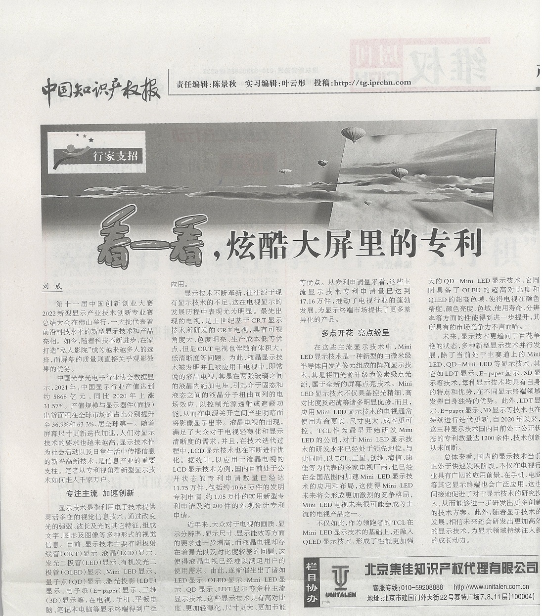 集佳文章《看一看,炫酷大屏里的專利》在《中國知識產權報》發表