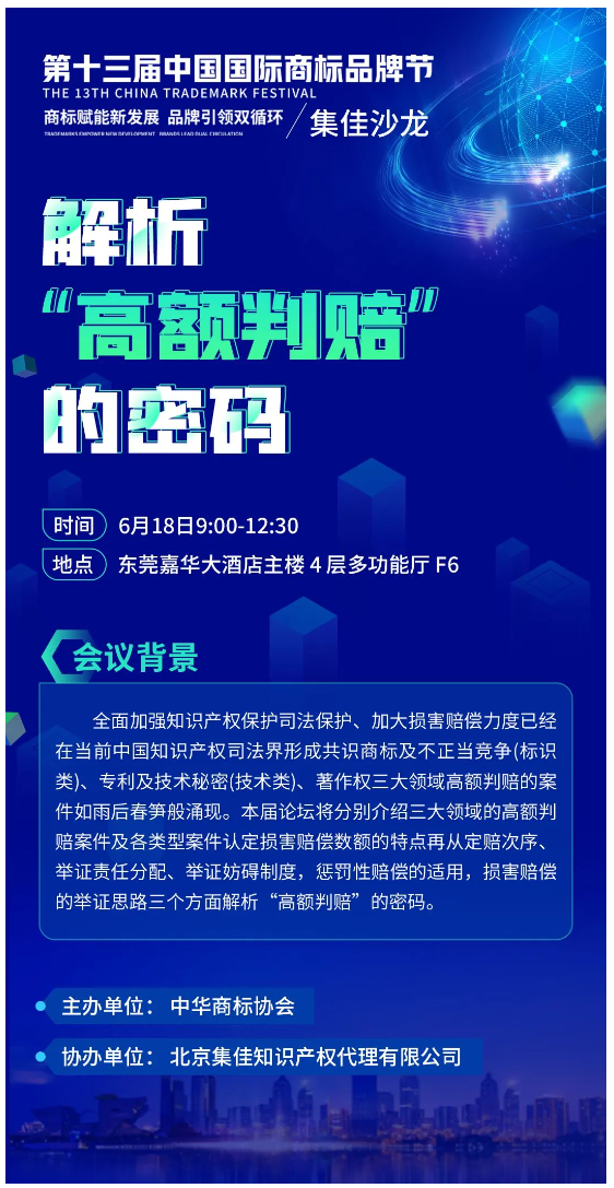 6月18日,集佳沙龍將在東莞嘉華大酒店主樓4層多功能廳F6舉辦,邀請資深法官、律師等眾多知名專家,共同解析知識產權案件“高額判賠”的密碼,屆時期待您的光臨!