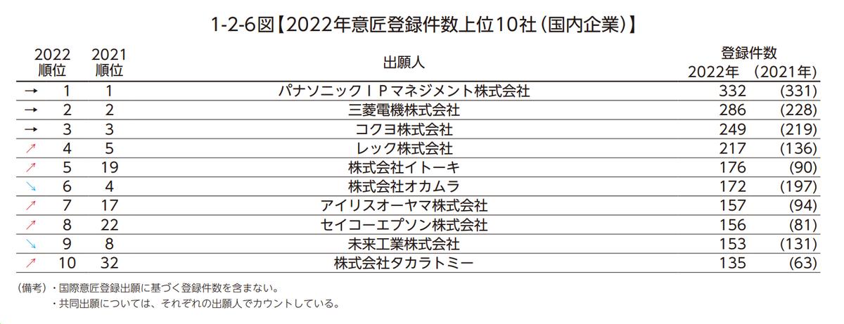 前10大日本國內企業外觀設計注冊量: