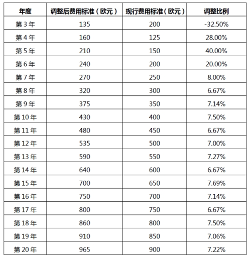 權項附加費(超過五個權項):25 歐元/項(當前為20 歐元)