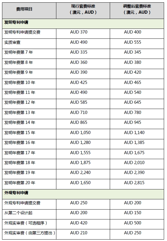 澳大利亞知識產權局每四年會針對官費進行一次調整,目前已在其官網公布了實施草案(Draft cost recovery implementation statement 2024-2025)并向公眾征求意見。據悉,澳大利亞知識產權局將于2024年7月公布最終版的官費調整金額,調整后的官費標準或將于2024年10月1日生效。