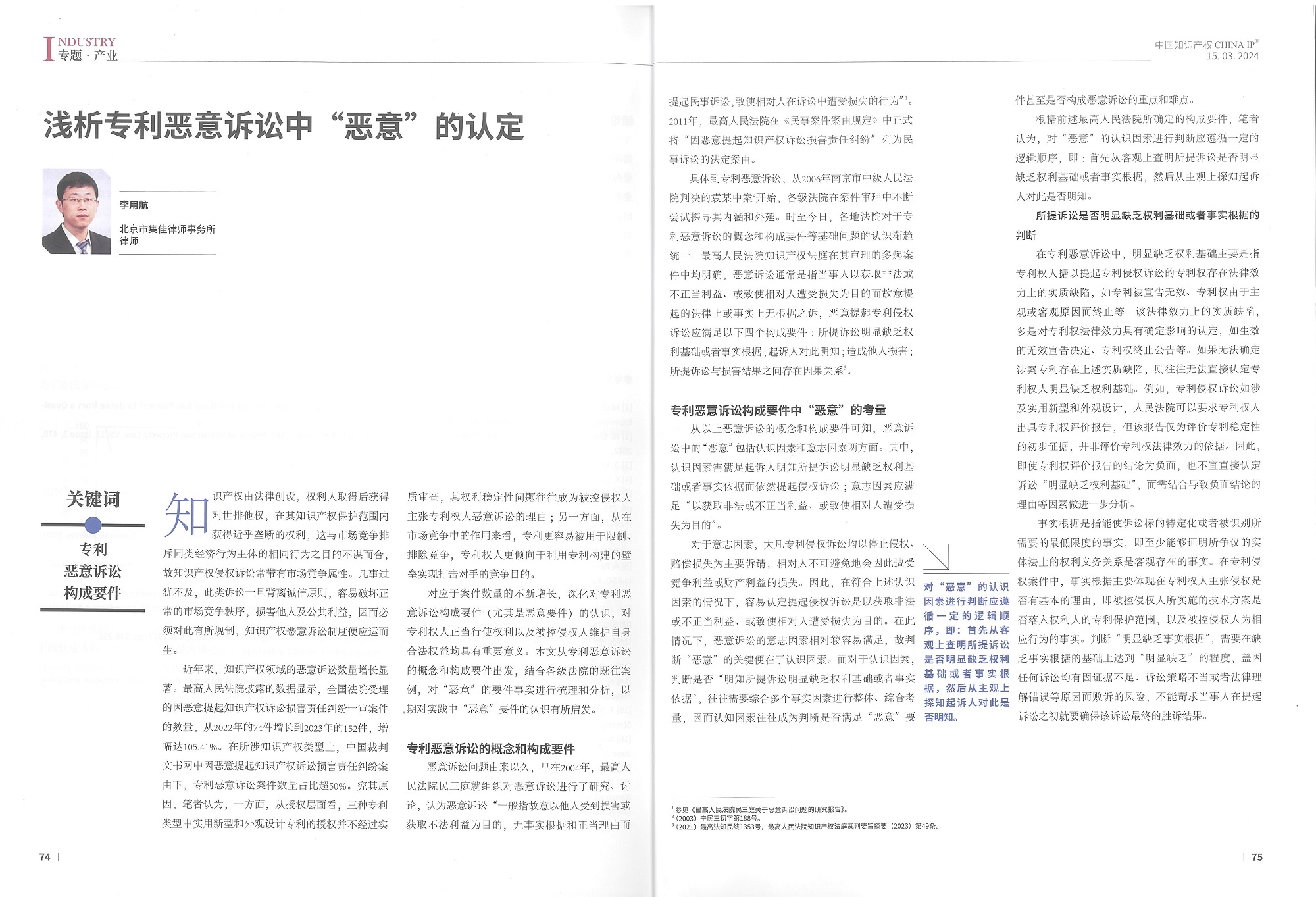 集佳文章《淺析專利惡意訴訟中“惡意”的認定》在《中國知識產權》發表