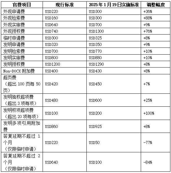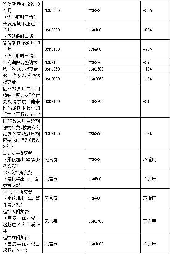 ?初始提案中上調幅度約5%的官費項目,本次普遍進一步上調至約8%,如臨時申請費、超頁費、多項引用附加費、答復延期費(非臨時申請)、發明授權費、年費等;