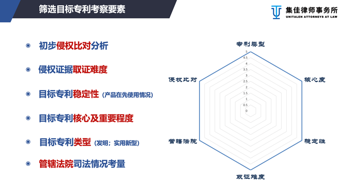 值得注意的是,在訴前維權專利篩選階段,備選專利穩定性分析工作應當與專利侵權比對工作形成緊密配合,將落入目標專利保護范圍的權利要求與存在穩定性的權利要求相匹配,綜合分析該備選專利的可訴性。