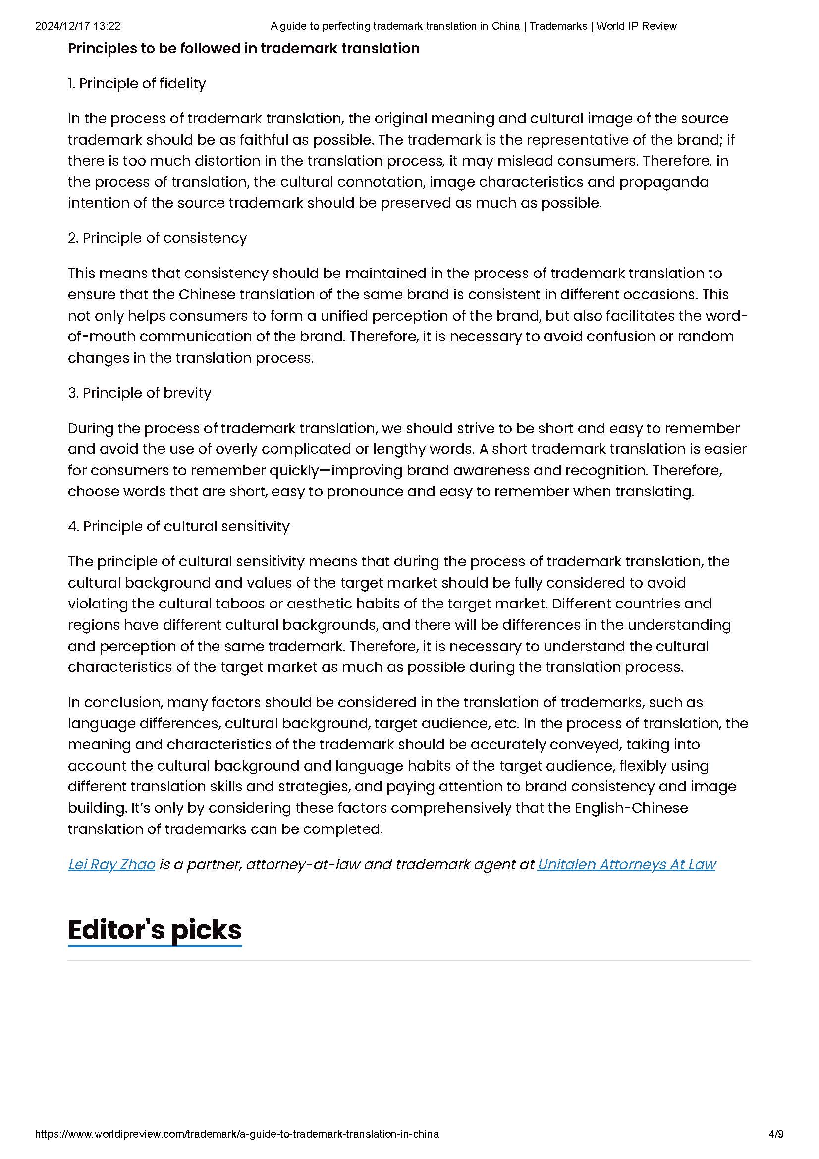 首頁 > 集佳知識產權代理有限公司 > 理論研究 > 媒體報道 > 集佳文章《A guide to perfecting trademark translation in China》在《wipr》發表