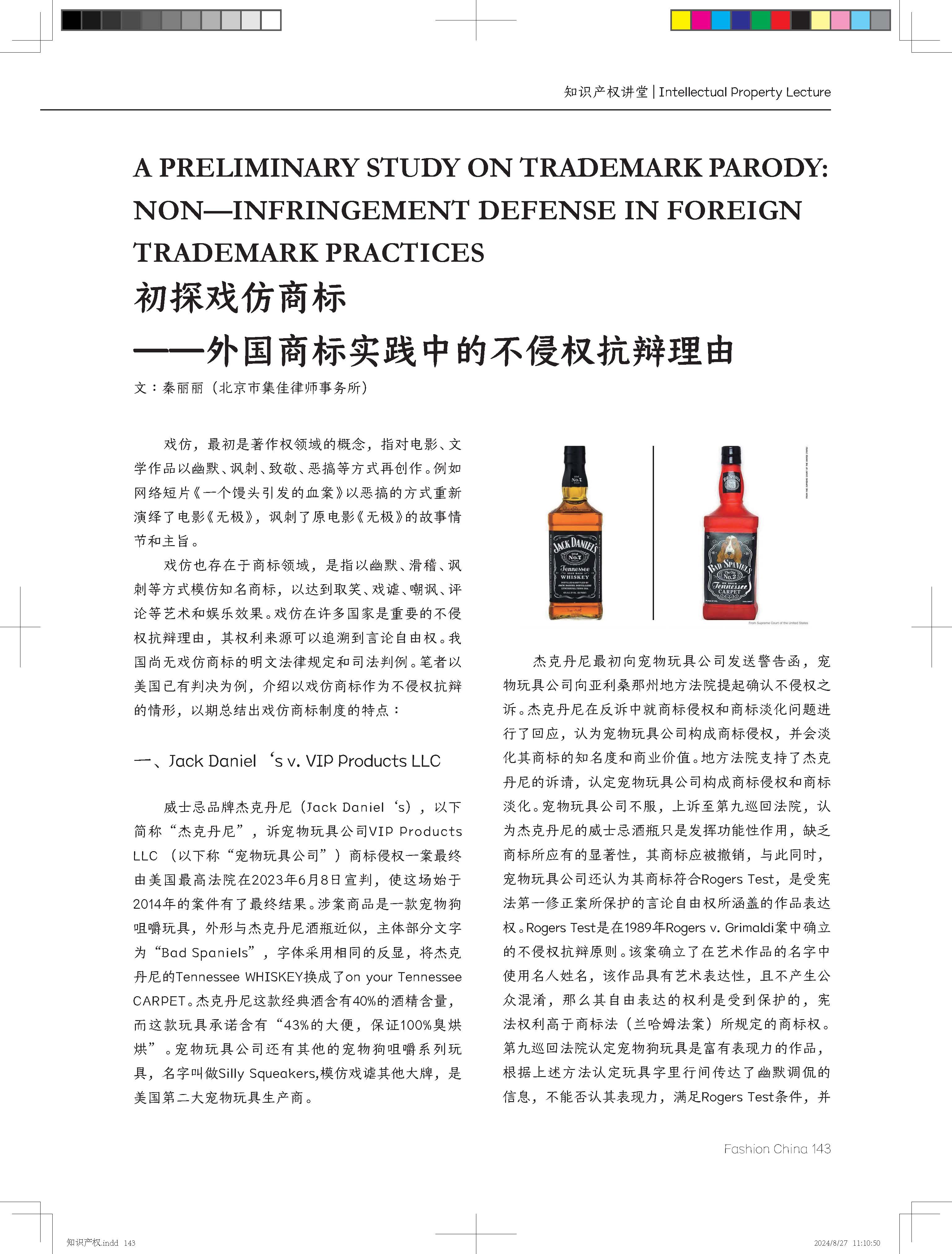 集佳文章《初探戲仿商標——外國商標實踐中的不侵權抗辯理由》在《服裝設計師》雜志發表