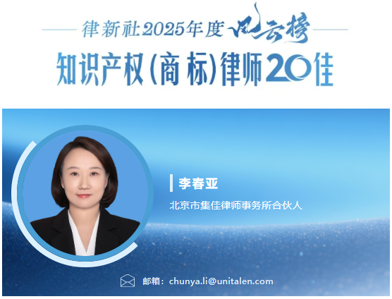 2025年10月22日,律新社重磅發布“律新社2025年度風云榜:知識產權(商標)律師20佳”榜單,集佳合伙人李春亞律師憑借在知識產權領域精湛的專業實力、杰出的業績表現及良好的客戶口碑,榮登20佳榜單!
